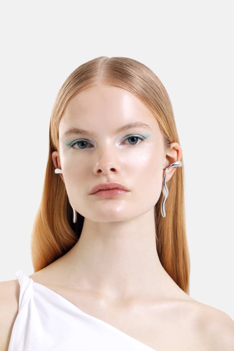 silberne flüssige ohrringe, die sich um das ohr legen