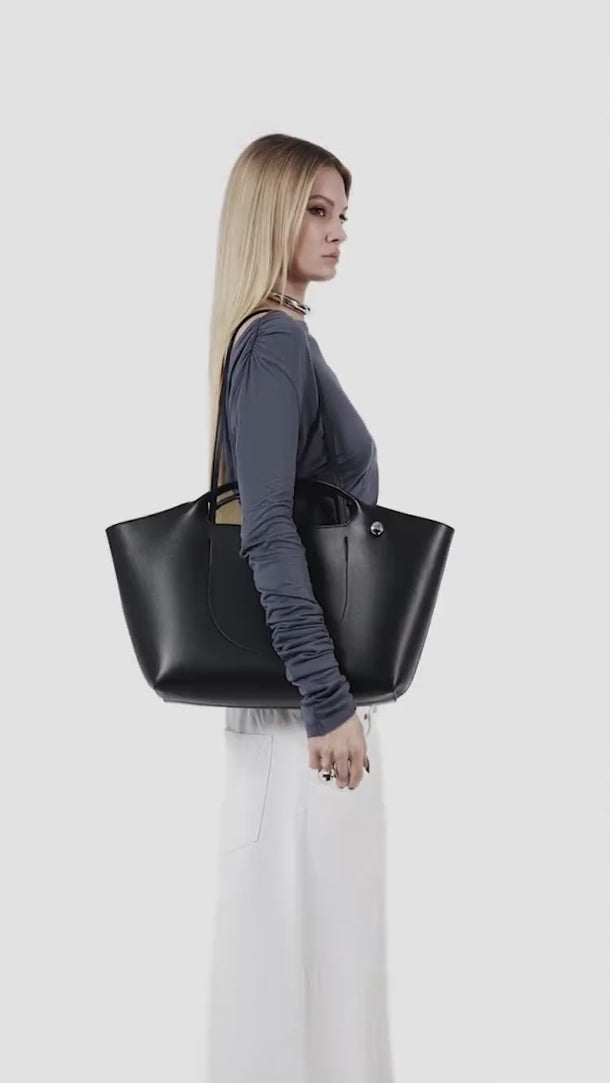 Si può indossare a tracolla, a spalla o portare a mano.
